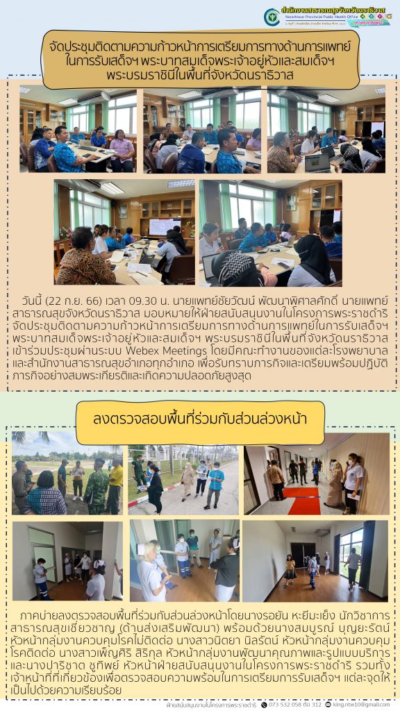 วันนี้ (22 ก.ย. 66) เวลา 09.30 น. นายแพทย์ชัยวัฒน์ พัฒนาพิศาลศักดิ์ นายแพทย์สาธารณสุขจังหวัดนราธิวาส มอบหมายให้ฝ่ายสนับสนุนงานในโครงการพระราชดำริ จัดประชุมติดตามความก้าวหน้าการเตรียมการทางด้านการแพทย์ในการรับเสด็จฯ พระบาทสมเด็จพระเจ้าอยู่หัวและสมเด็จฯ พระบรมราชินีในพื้นที่จังหวัดนราธิวาส