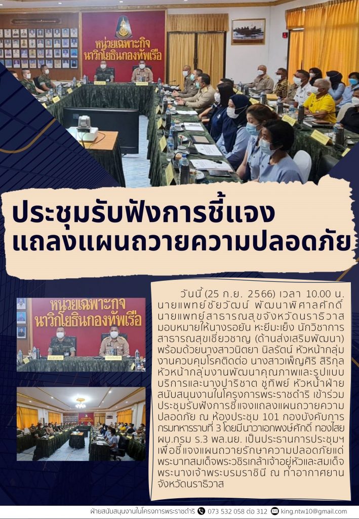 นาวาเอกพงษ์ศักดิ์ ทองไสย ผบ.กรม ร.3 พล.นย. เป็นประธานการประชุมฯ เพื่อชี้แจงแผนถวายรักษาความปลอดภัยแด่พระบาทสมเด็จพระวชิรเกล้าเจ้าอยู่หัวและสมเด็จพระนางเจ้าพระบรมราชินี ณ ท่าอากาศยานจังหวัดนราธิวาส