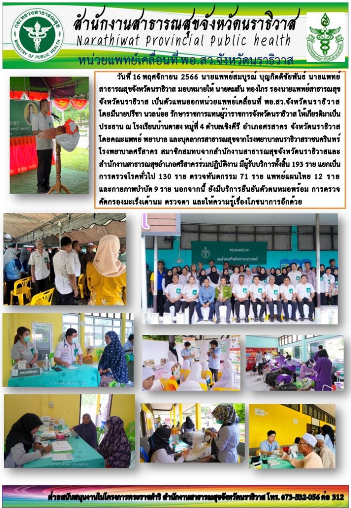 หน่วยแพทย์เคลื่อนที่ พอ.สว. จังหวัดนราธิวาสโครงการพระราชดำริ / 19/11/2023 อ่านแล้ว : 2,123 FacebookFacebookXXLINELine
