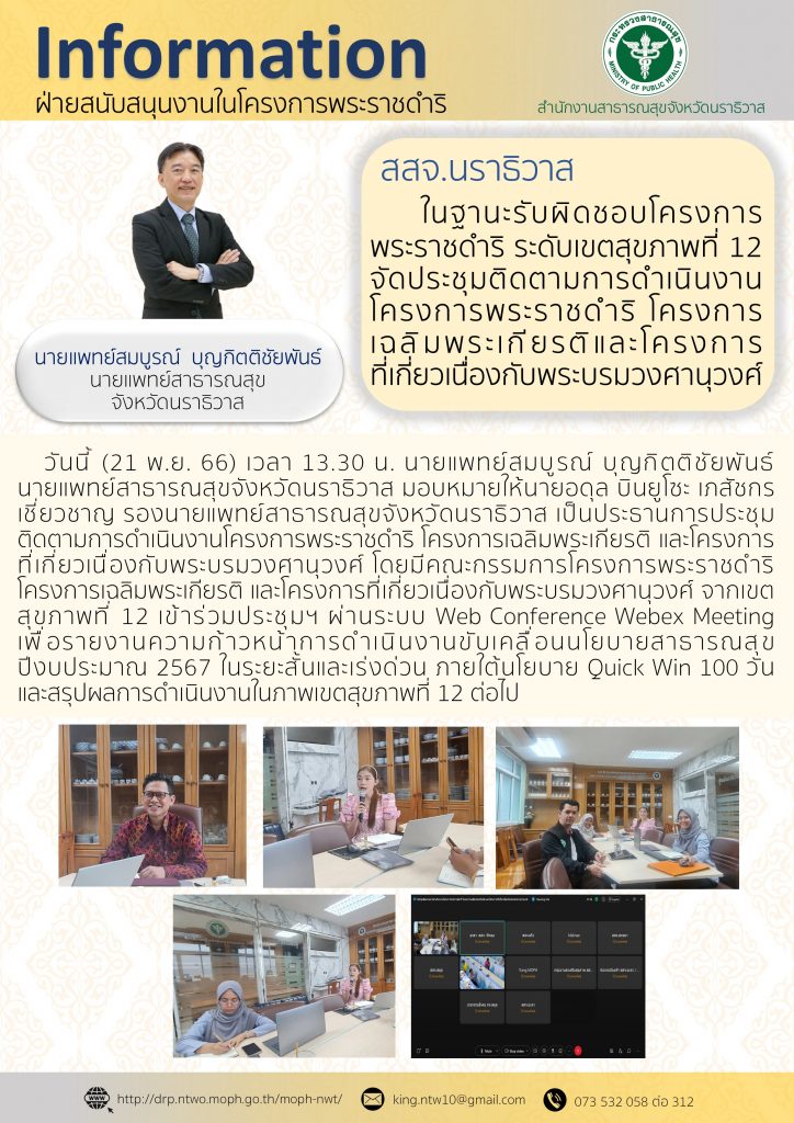 วันนี้ (21 พ.ย. 66) เวลา 13.30 น. นายแพทย์สมบูรณ์ บุญกิตติชัยพันธ์ นายแพทย์สาธารณสุขจังหวัดนราธิวาส มอบหมายให้นายอดุล บินยูโซะ เภสัชกรเชี่ยวชาญ รองนายแพทย์สาธารณสุขจังหวัดนราธิวาส เป็นประธานการประชุมติดตามการดำเนินงานโครงการพระราชดำริ โครงการเฉลิมพระเกียรติ และโครงการที่เกี่ยวเนื่องกับพระบรมวงศานุวงศ์ โดยมีคณะกรรมการโครงการพระราชดำริ โครงการเฉลิมพระเกียรติ และโครงการที่เกี่ยวเนื่องกับพระบรมวงศานุวงศ์ จากเขตสุขภาพที่ 12 เข้าร่วมประชุมฯ ผ่านระบบ Web Conference Webex Meeting เพื่อรายงานความก้าวหน้าการดำเนินงานขับเคลื่อนนโยบายสาธารณสุข ปีงบประมาณ 2567 ในระยะสั้นและเร่งด่วน ภายใต้นโยบาย Quick Win 100 วัน