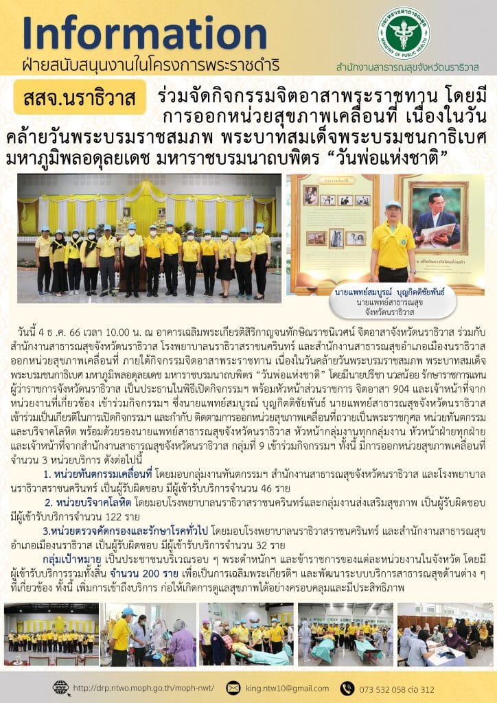 เข้าร่วมเป็นเกียรติในการเปิดกิจกรรมฯ และกำกับ ติดตามการออกหน่วยสุขภาพเคลื่อนที่ถวายเป็นพระราชกุศล หน่วยทันตกรรมและบริจาคโลหิต พร้อมด้วยรองนายแพทย์สาธารณสุขจังหวัดนราธิวาส หัวหน้ากลุ่มงานทุกกลุ่มงาน หัวหน้าฝ่ายทุกฝ่าย และเจ้าหน้าที่จากสำนักงานสาธารณสุขจังหวัดนราธิวาส กลุ่มที่ 9 เข้าร่วมกิจกรรมฯ ทั้งนี้ มีการออกหน่วยสุขภาพเคลื่อนที่ จำนวน 3 หน่วยบริการ ดังต่อไปนี้