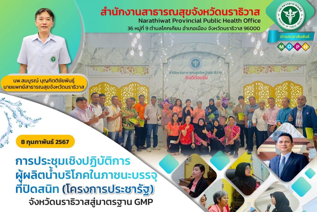 วันที่ 8 กุมภาพันธ์ พ.ศ.2567 นพ.สมบูรณ์ บุญกิตติชัยพันธ์นายแพทย์สาธารณสุขจังหวัดนราธิวาส มอบหมายให้กลุ่มงานคุ้มครองผู้บริโภคและเภสัชสาธารณสุข โดยมี ภก.อดุล บินยูโซะรองนายแพทย์สาธารณสุขจังหวัดนราธิวาส เป็นประธานเปิดการประชุมเชิงปฏิบัติการผู้ผลิตน้ำบริโภคในภาชนะบรรจุที่ปิดสนิท (โครงการประชารัฐ)จังหวัดนราธิวาส สู่มาตรฐาน GMP ณ ห้องประชุมพระบารมี (ชั้น 2)สำนักงานสาธารณสุขจังหวัดนราธิวาส กลุ่มเป้าหมาย 50 คน โดยมีวัตถุประสงค์เพื่อชี้แจงเกณฑ์ GMP ตามประกาศกระทรวงสาธารณสุข (ฉบับที่ 420) พ.ศ.2563 หลักเกณฑ์เกี่ยวกับ วิธีการผลิต เครื่องมือเครื่องใช้ในการผลิตและการเก็บรักษาอาหารรวมถึงการควบคุมคุณภาพมาตรฐานน้ำบริโภคในภาชนะบรรจุที่ปิดสนิท โดยมีวิทยากรจากศูนย์วิทยาศาสตร์การแพทย์ที่ 12 สงขลา วิทยากรจากสำนักงานสาธารณสุขจังหวัดนราธิวาส เพื่อผลักดันเพื่อผลักดันผู้ประกอบการน้ำบริโภคฯ ในจังหวัดนราธิวาสให้ได้มาตรฐานตามเกณฑ์ที่กำหนดต่อไป