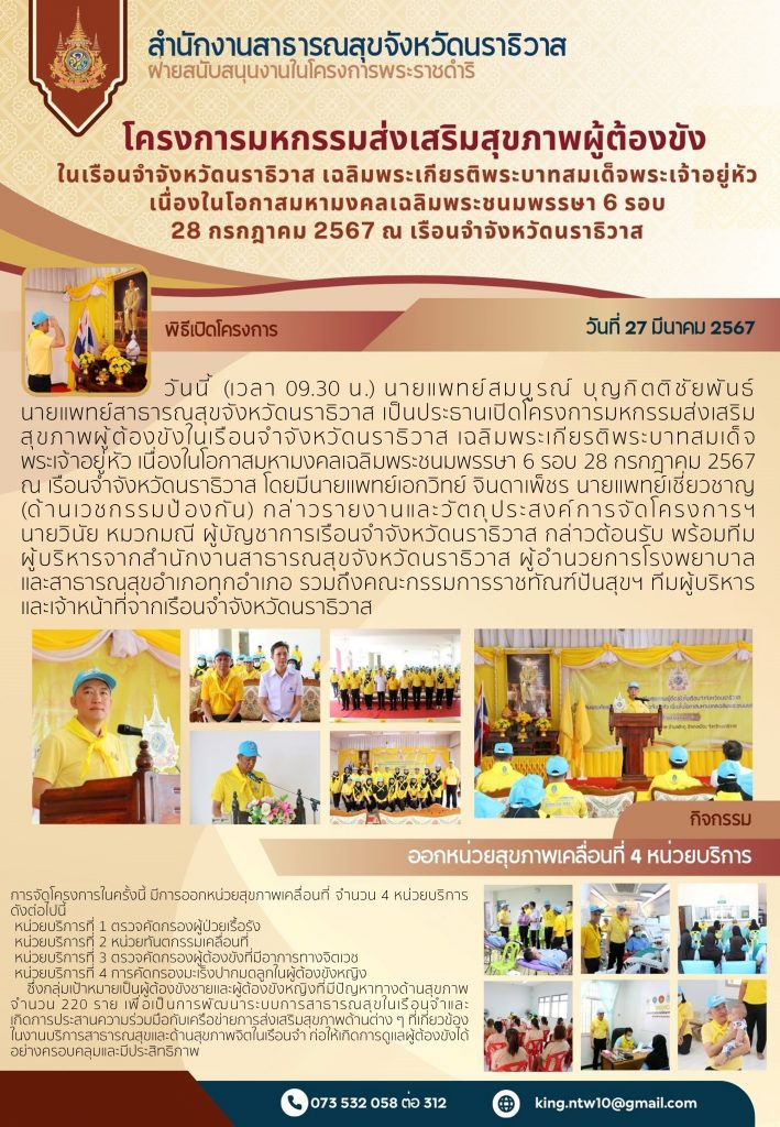 วันนี้ (เวลา 09.30 น.) นายแพทย์สมบูรณ์ บุญกิตติชัยพันธ์ นายแพทย์สาธารณสุขจังหวัดนราธิวาส เป็นประธานเปิดโครงการมหกรรมส่งเสริมสุขภาพผู้ต้องขังในเรือนจำจังหวัดนราธิวาส เฉลิมพระเกียรติพระบาทสมเด็จพระเจ้าอยู่หัว เนื่องในโอกาสมหามงคลเฉลิมพระชนมพรรษา 6 รอบ 28 กรกฎาคม 2567 ณ เรือนจำจังหวัดนราธิวาส โดยมีนายแพทย์เอกวิทย์ จินดาเพ็ชร นายแพทย์เชี่ยวชาญ (ด้านเวชกรรมป้องกัน) กล่าวรายงานและวัตถุประสงค์การจัดโครงการฯ