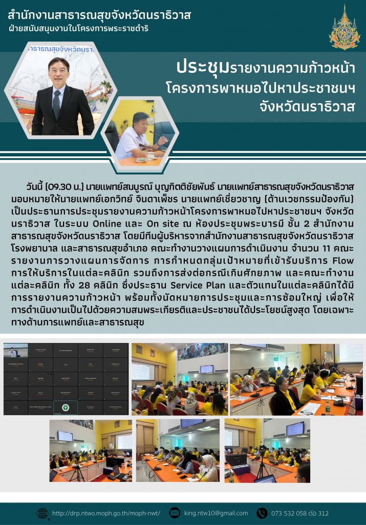 วันนี้ (09.30 น.) นายแพทย์สมบูรณ์ บุญกิตติชัยพันธ์ นายแพทย์สาธารณสุขจังหวัดนราธิวาส มอบหมายให้นายแพทย์เอกวิทย์ จินดาเพ็ชร นายแพทย์เชี่ยวชาญ (ด้านเวชกรรมป้องกัน) เป็นประธานการประชุมรายงานความก้าวหน้าโครงการพาหมอไปหาประชาชนฯ จังหวัดนราธิวาส ในระบบ Online และ On site ณ ห้องประชุมพระบารมี ชั้น 2 สำนักงานสาธารณสุขจังหวัดนราธิวาส โดยมีทีมผู้บริหารจากสำนักงานสาธารณสุขจังหวัดนราธิวาส โรงพยาบาล และสาธารณสุขอำเภอ คณะทำงานวางแผนการดำเนินงาน จำนวน 11 คณะ รายงานการวางแผนการจัดการ การกำหนดกลุ่มเป้าหมายที่เข้ารับบริการ Flow การให้บริการในแต่ละคลินิก รวมถึงการส่งต่อกรณีเกินศักยภาพ และคณะทำงานแต่ละคลินิก ทั้ง 28 คลินิก ซึ่งประธาน Service Plan และตัวแทนในแต่ละคลินิกได้มีการรายงานความก้าวหน้า พร้อมทั้งนัดหมายการประชุมและการซ้อมใหญ่ เพื่อให้การดำเนินงานเป็นไปด้วยความสมพระเกียรติและประชาชนได้ประโยชน์สูงสุด โดยเฉพาะทางด้านการแพทย์และสาธารณสุข
