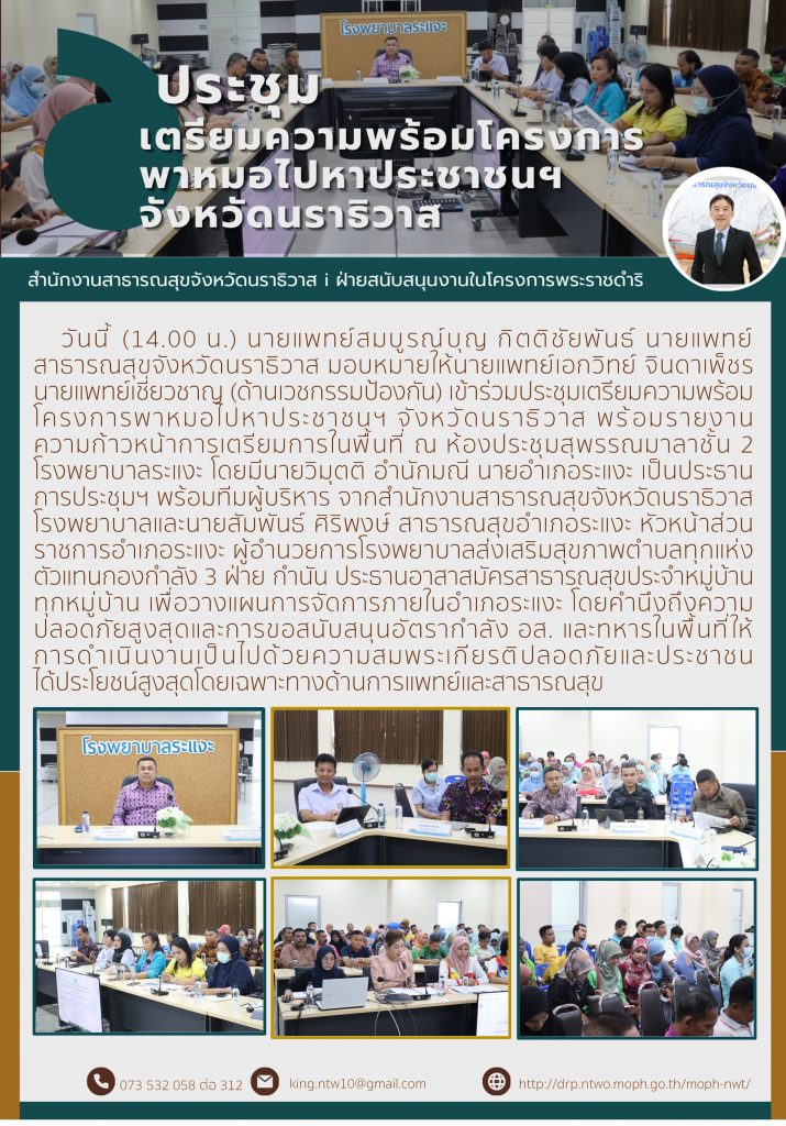 วันนี้ (14.00 น.) นายแพทย์สมบูรณ์บุญ กิตติชัยพันธ์ นายแพทย์สาธารณสุขจังหวัดนราธิวาส มอบหมายให้นายแพทย์เอกวิทย์ จินดาเพ็ชร นายแพทย์เชี่ยวชาญ (ด้านเวชกรรมป้องกัน) เข้าร่วมประชุมเตรียมความพร้อมโครงการพาหมอไปหาประชาชนฯ จังหวัดนราธิวาส พร้อมรายงานความก้าวหน้าการเตรียมการในพื้นที่ ณ ห้องประชุมสุพรรณมาลาชั้น 2 โรงพยาบาลระแงะ โดยมีนายวิมุตติ อำนักมณี นายอำเภอระแงะ เป็นประธานการประชุมฯ พร้อมทีมผู้บริหาร จากสำนักงานสาธารณสุขจังหวัดนราธิวาส โรงพยาบาลและนายสัมพันธ์ ศิริพงษ์สาธารณสุขอำเภอระแงะ หัวหน้าส่วนราชการอำเภอระแงะ ผู้อำนวยการโรงพยาบาลส่งเสริมสุขภาพตำบลทุกแห่ง ตัวแทนกองกำลัง 3 ฝ่าย กำนัน ประธานอาสาสมัครสาธารณสุขประจำหมู่บ้านทุกหมู่บ้าน เพื่อวางแผนการจัดการภายในอำเภอระแงะ โดยคำนึงถึงความปลอดภัยสูงสุดและการขอสนับสนุนอัตรากำลัง อส. และทหารในพื้นที่ให้