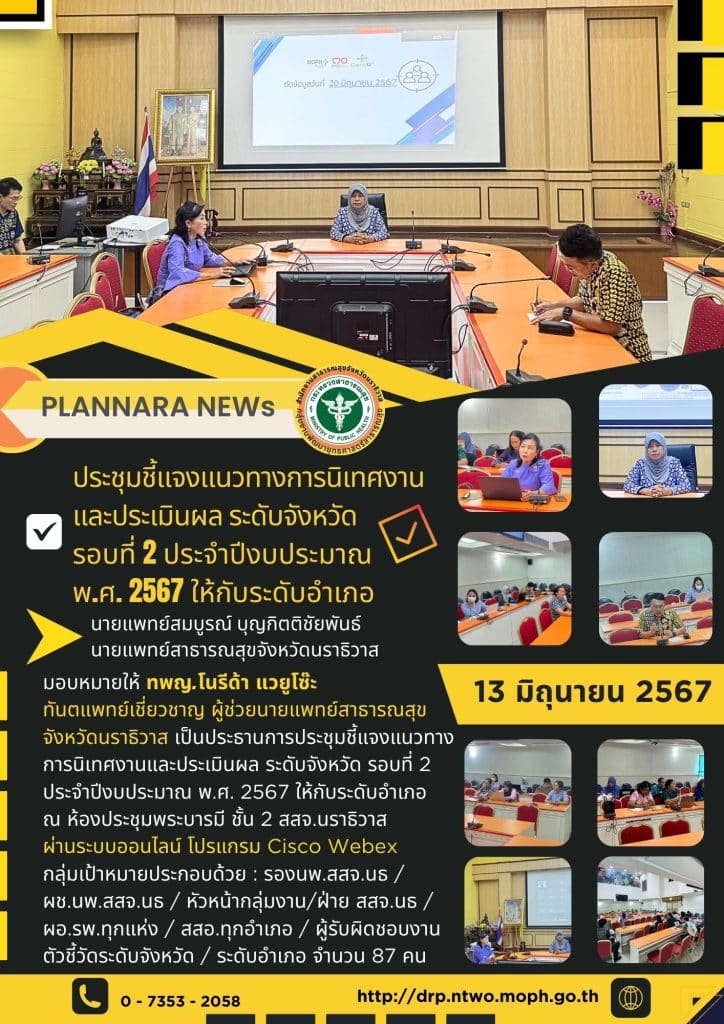 มอบหมายให้ ทพญ.โนรีด้า แวยูโซ๊ะทันตแพทย์เชี่ยวชาญ ผู้ช่วยนายแพทย์สาธารณสุขจังหวัดนราธิวาส เป็นประธานการประชุมชี้แจงแนวทางการนิเทศงานและประเมินผล ระดับจังหวัด รอบที่ 2 ประจำปีงบประมาณ พ.ศ. 2567 ให้กับระดับอำเภอณ ห้องประชุมพระบารมี ชั้น 2 สสจ.นราธิวาส ผ่านระบบออนไลน์ โปรแกรม Cisco Webexกลุ่มเป้าหมายประกอบด้วย : รองนพ.สสจ.นธ /ผช.นพ.สสจ.นธ / หัวหน้ากลุ่มงาน/ฝ่าย สสจ.นธ / ผอ.รพ.ทุกแห่ง / สสอ.ทุกอำเภอ / ผู้รับผิดชอบงานตัวชี้วัดระดับจังหวัด / ระดับอำเภอ จำนวน 87 คน