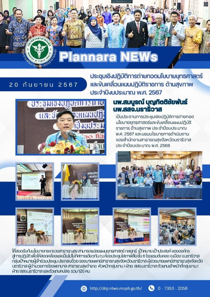 20 กันยายน 2567 นพ.สมบูรณ์ บุญกิตติชัยพันธ์ นพ.สสจ.นราธิวาส เป็นประธานการประชุมเชิงปฏิบัติการถ่ายทอดนโยบายยุทธศาสตร์และขับเคลื่อนแผนปฏิบัติราชการ ด้านสุขภาพ ประจำปีงบประมาณ พ.ศ. 2567 และมอบนโยบายการดำเนินงาน ของสำนักงานสาธารณสุขจังหวัดนราธิวาส ประจำปีงบประมาณ พ.ศ. 2568 ให้สอดรับกับนโยบายกระทรวงสาธารณสุข สามารถแปลงแผนยุทธศาสตร์ กลยุทธ์ เป้าหมาย เป้าประสงค์ ขององค์กร สู่การปฏิบัติ เพื่อให้สอดคล้องและเป็นไปในทิศทางเดียวกัน ณ ห้องประชุมโสภาพิสัย ชั้น 6 โรงแรมตันหยง อ.เมือง จ.นราธิวาส กลุ่มเป้าหมายผู้เข้าร่วมประชุม ประกอบด้วย รองนายแพทย์สาธารณสุขจังหวัดนราธิวาส ผู้ช่วยนายแพทย์สาธารณสุขจังหวัดนราธิวาส ผู้อำนวยการโรงพยาบาล สาธารณสุขอำเภอ หัวหน้ากลุ่มงาน / ฝ่าย สสจ.นราธิวาส ตัวแทนเจ้าหน้าที่กลุ่มงาน / ฝ่าย สสจ.นราธิวาส และตัวแทนคปสอ. รวม 120 คน